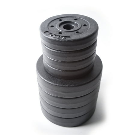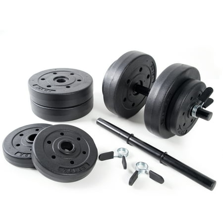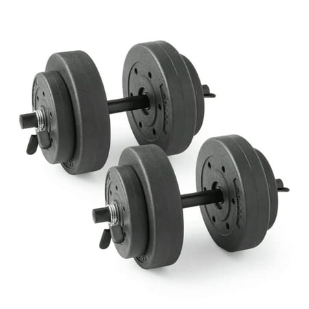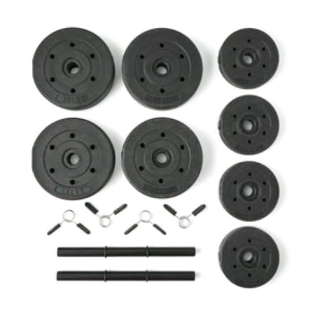 The Athletic Works 40 lb Adjustable Vinyl Dumbbell Set is an effective workout choice for both beginners and advanced fitness enthusiasts. The 14 piece set comes with two tubular steel bars, four 7.5lb plates, four 2.5lb plates and four spring clip collars for securing cement-filled plates. Simply slide the needed weight plates onto the ends of the bars that will best challenge your fitness level and goals to help improve your strength, confidence and health. This dumbbell weight set, 40 lbs is designed to develop strength and definition in arms, shoulders and backs.