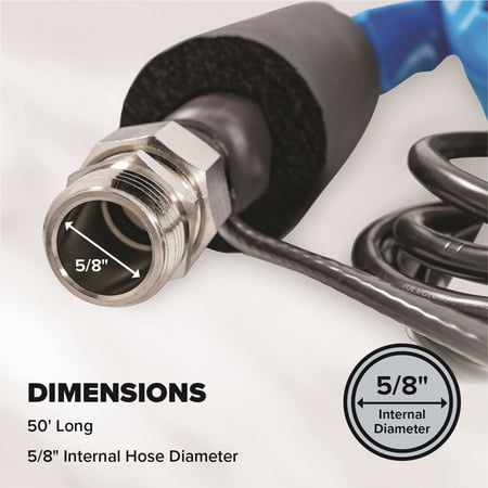 Experience uninterrupted water flow, even in freezing conditions, with the Camco 50' Heated Drinking Water Hose. This heated water hose for RVs is also perfect for livestock, gardens, kennels, and more. It meets the highest standards for clean drinking water. Crafted from high-quality materials, this heated RV hose is built to withstand cold weather conditions while maintaining peak performance. Easy to use with the provided male-to-male adapter, simply connect the hose at either end (based on the location of the electrical outlet). Whether you're an outdoor enthusiast braving the winter chill or a homeowner in need of a reliable water source, trust this heated water hose to deliver. Don't let the cold stop you; get your hands on Camco's 50' Heated Drinking Water Hose. Enjoy peace of mind and convenience with this RV camping essential! Model#: 22912.