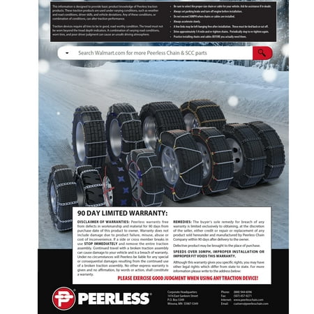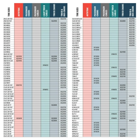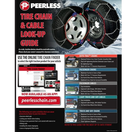 Be prepared for anything this winter with the 0231810 Auto-Trac Self-Tightening Traction Chain. These Auto-Trac chains are designed for light trucks and SUVs and has a high-impact, self-tightening ratchet system that ensures a snug fit and eliminates the need to stop and re-tighten the chains after installation. The split outside chain with two ratchet connectors allows for easy installation without needing to move the vehicle. The Auto-Trac also features an aggressive diamond-patterned, cross-chain design for superior traction and a smooth ride during use. The case-hardened alloy cross-chains provide extended wear life over standard link products. Whether you live in an area that sees snow, or are planning on making a winter trip, having sure, reliable traction in inclement conditions is a must. Fits the following tire sizes: 225/55R19; 225/60R18; 235/50R19; 245/45R19; 245/70R15; 255/40R20; 255/45R19; 285/35R20; 295/30R20. Each package contains one pair of chains and includes a waterproof instruction mat to help you get them properly installed. Peerless Chain #0231810